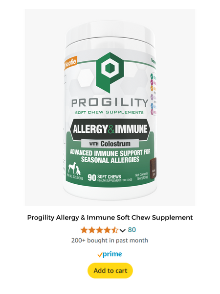 Nootie’s Progility Allergy and Immune Supplements are soft chews made with active ingredients that support immune system function, like colostrum, apple cider vinegar, bromelain, and chaga and reishi mushrooms.