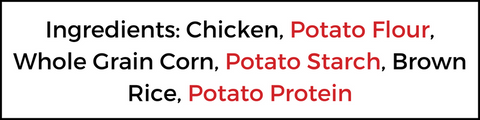 You can see here that chicken is the number one ingredient. However, you also see that this recipe includes potato flour, potato starch, and potato protein. By splitting a potato into three “different” ingredients, it allows the manufacturer to state that chicken is the #1 ingredient, when the majority of the recipe is actually made of - you guessed it, potatoes.