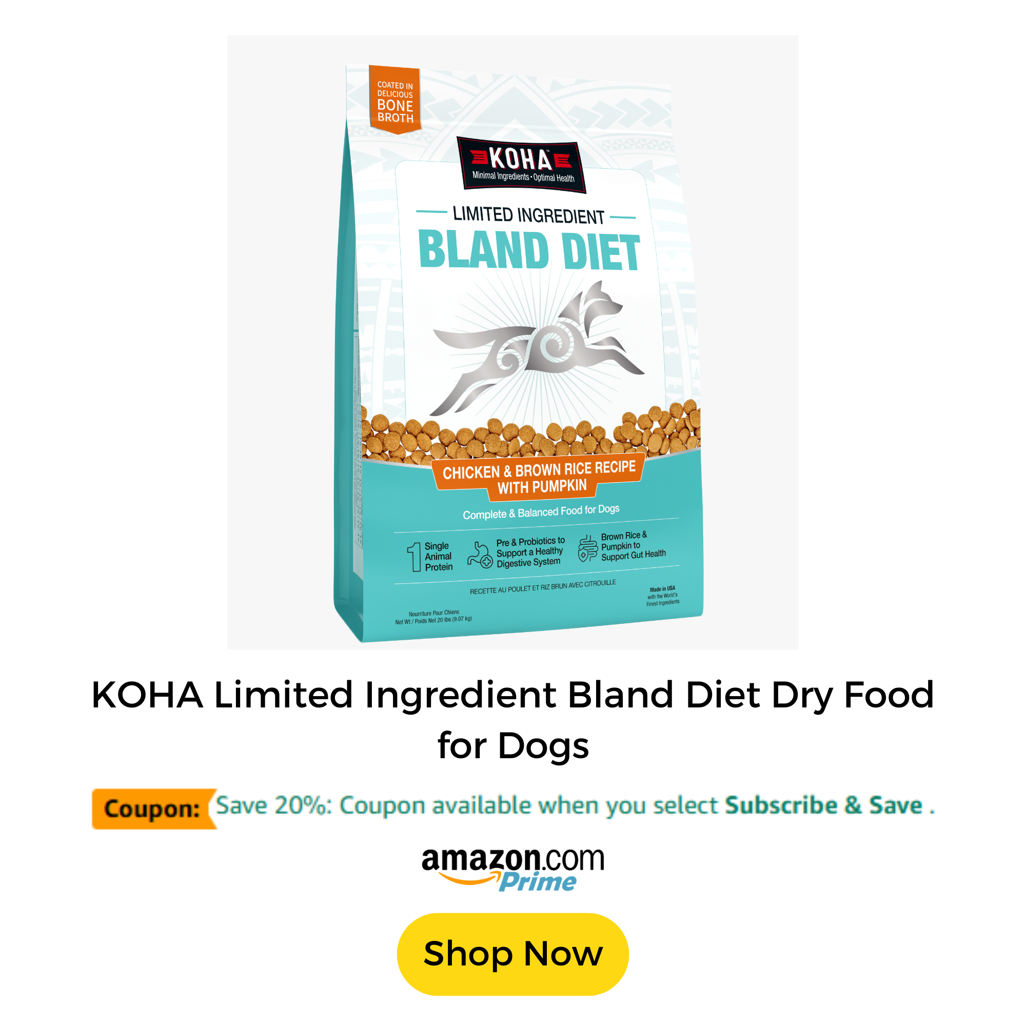 If your dog suffers from chronic digestive issues, your best bet may be switching to KOHA Bland Diet for Dogs, rather than staying on their current diet or returning to their original diet after a brief period of homemade bland foods. Made with easily digestible proteins like chicken, beef, or lamb, this gentle formula helps soothe digestive flare-ups.Â